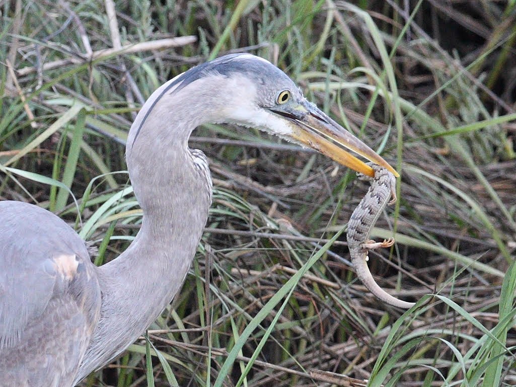 This Great Blue Heron has caught an alligator lizard, which it will swallow whole. Great Blues eat primarily fish, but also eat small rodents, amphibians, reptiles, crustaceans, and insects. When hunting, they stand still or step v-e-r-y slowly forward. But when they strike, they stab their bill and neck forward with lightning speed. They visit Rose Canyon and Marian Bear Parks to hunt for gophers and lizards. Rose Canyon and San Clemente Canyon (Marian Bear Park) form the Rose Creek watershed. Rain and urban runoff flow into these canyons, then south via Rose Creek into Mission Bay. Keeping the watershed clean and preserving its remaining undeveloped land helps wildlife and keeps Mission Bay healthy for swimming and kayaking.