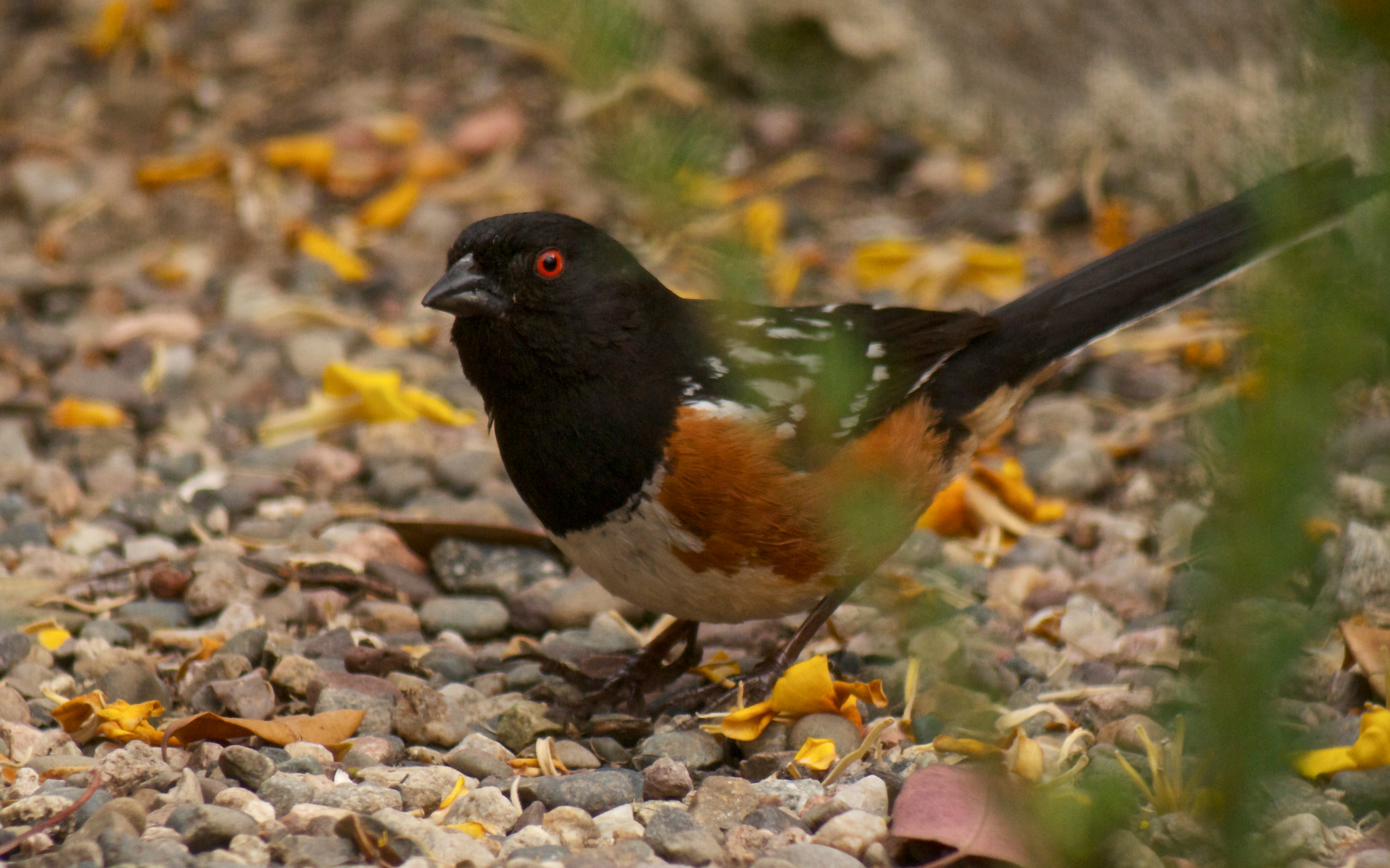 Spotted Towhees are large sparrows that can be hard to find because they spend their time on the ground under bushes and trees looking for food. You might spot one if you listen for the scratching sound they make as they hop backward with both feet to stir up the dry leaf litter in search of seeds and invertebrates to eat. They live year-round in Rose Canyon, but the best time to find them is in spring during the breeding season when the males (like the one in this photo) perch in trees and call repeatedly to defend their territories and attract a mate. They make a dry trill like a piece of paper stuck in a bicycle wheel. Please keep your cat indoors. Spotted towhees build their nests on or near the ground, so housecats let outside prey on them.