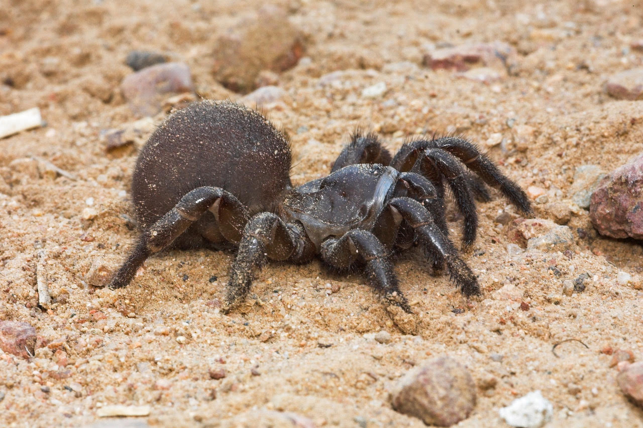 These spiders are harmless to humans but have sharp fangs that stab downward into their prey. They use a spiny rake on their jaws to dig a tube-like tunnel in the ground about ¾ inch wide
